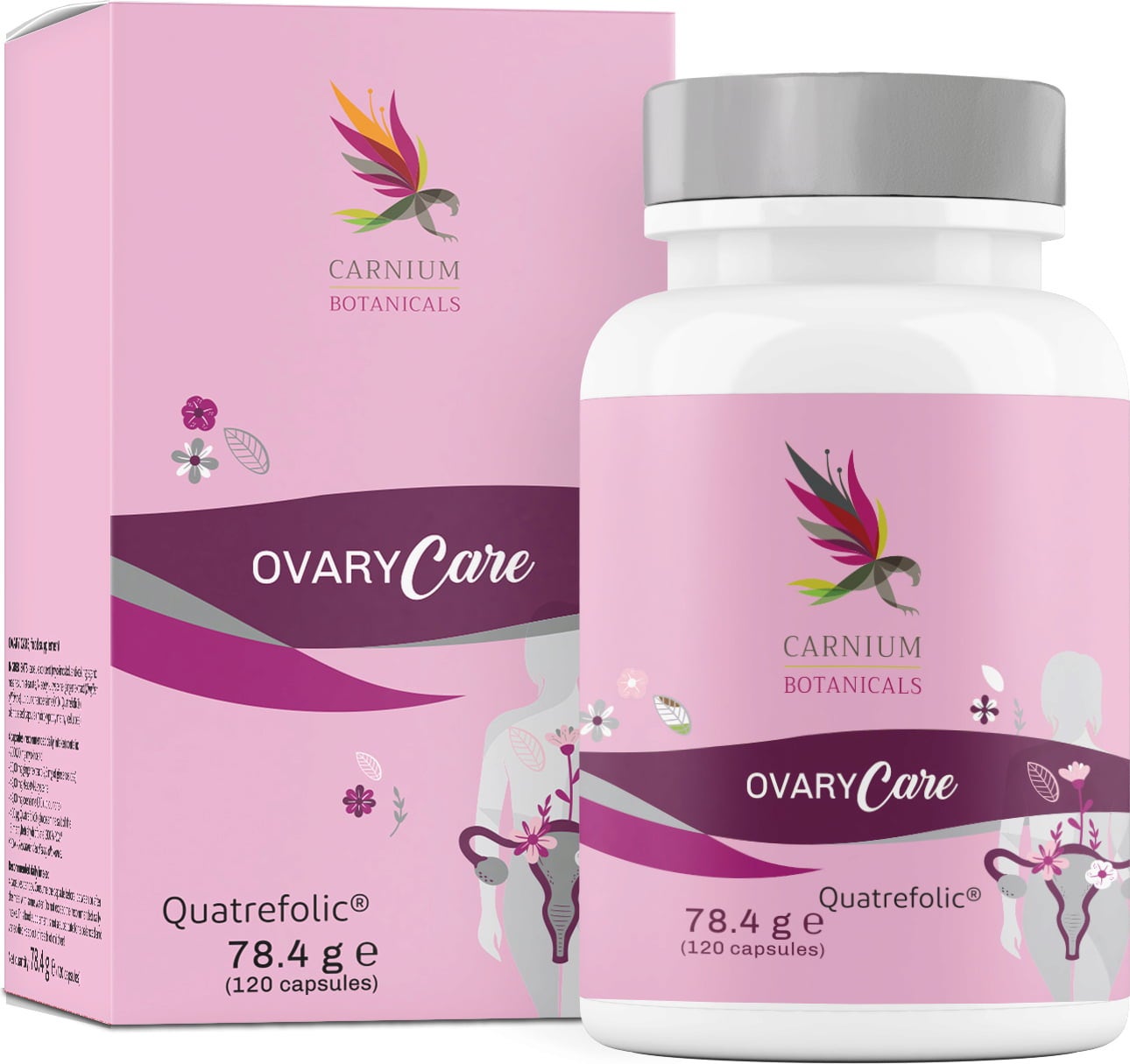 Carnium Botanicals -tuotteen Ovary Care tarjoaa naisille tukea ainesosilla kuten myo-inositoli, inkivääri, koentsyymi Q10 ja Quatrefolic®. Kapselit sopivat yli 18-vuotiaille henkilöille. Koostumus on gluteeniton, laktoositon ja säilöntäaineeton.
