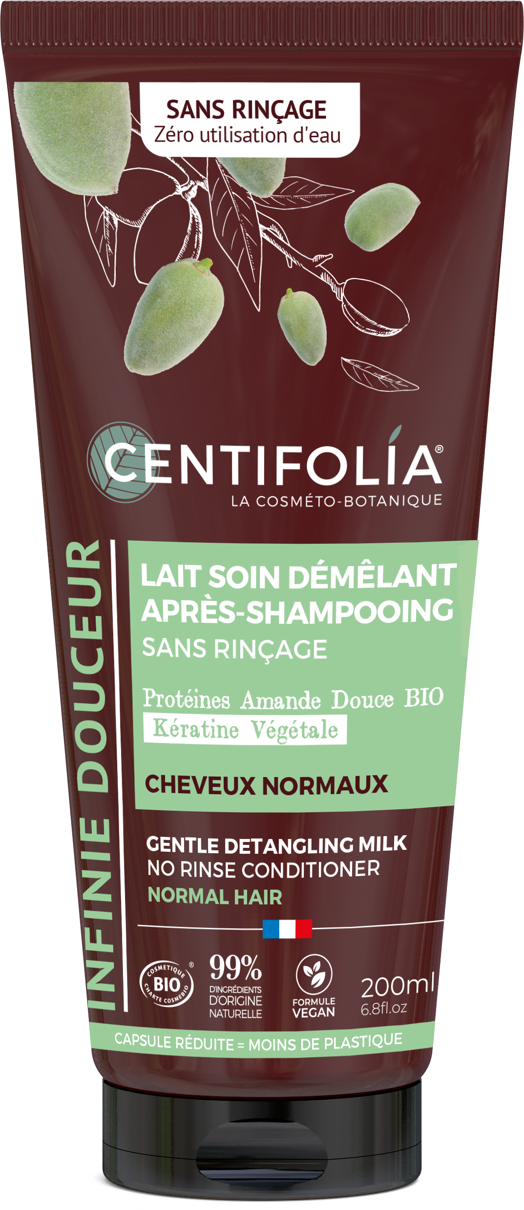 Tämä hoitomilkki sopii normaalille hiukselle, selvittää ja kosteuttaa ilman huuhtelua. Sen koostumus sisältää makean mantelin proteiineja ja kasvipohjaista keratiinia, jotka kosteuttavat ja antavat hiuksille pehmeyttä ilman, että hius latistuu. Tuote tuo uutta keveyttä ja helpottavaa kammattavuutta.