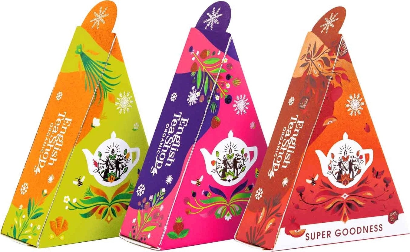 Kun päivät kylmenevät, on tuskin mitään mukavampaa kuin nauttia kauniista teekupista. Iloita perhettä tai ystäviä tällä kauniilla lahjapakkauksella, joka sisältää yhteensä 12 suurta, kompostoituvaa pyramidipussia kolmessa ihanassa talviteesekoituksessa: