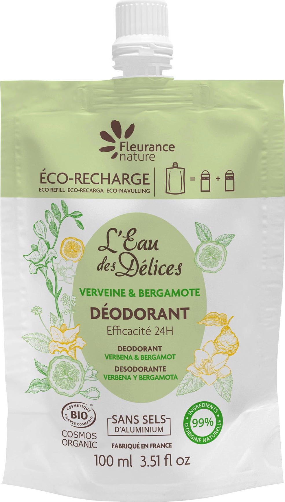 Tämä täyttölaite on kehitetty, jotta Fleurance roll-on -suihke on helppo täyttää uudelleen ja välttää näin jätettä. Siinä on miellyttävä verbenan ja bergamotin tuoksu. Se vähentää epämiellyttäviä hajuja tukahduttamatta luonnollista hikoiluprosessia. Deodorantti antaa välittömän ja pitkäkestoisen raikkauden tunteen. Levittämisen jälkeen se kuivuu nopeasti jättämättä tahroja vaatteisiin.