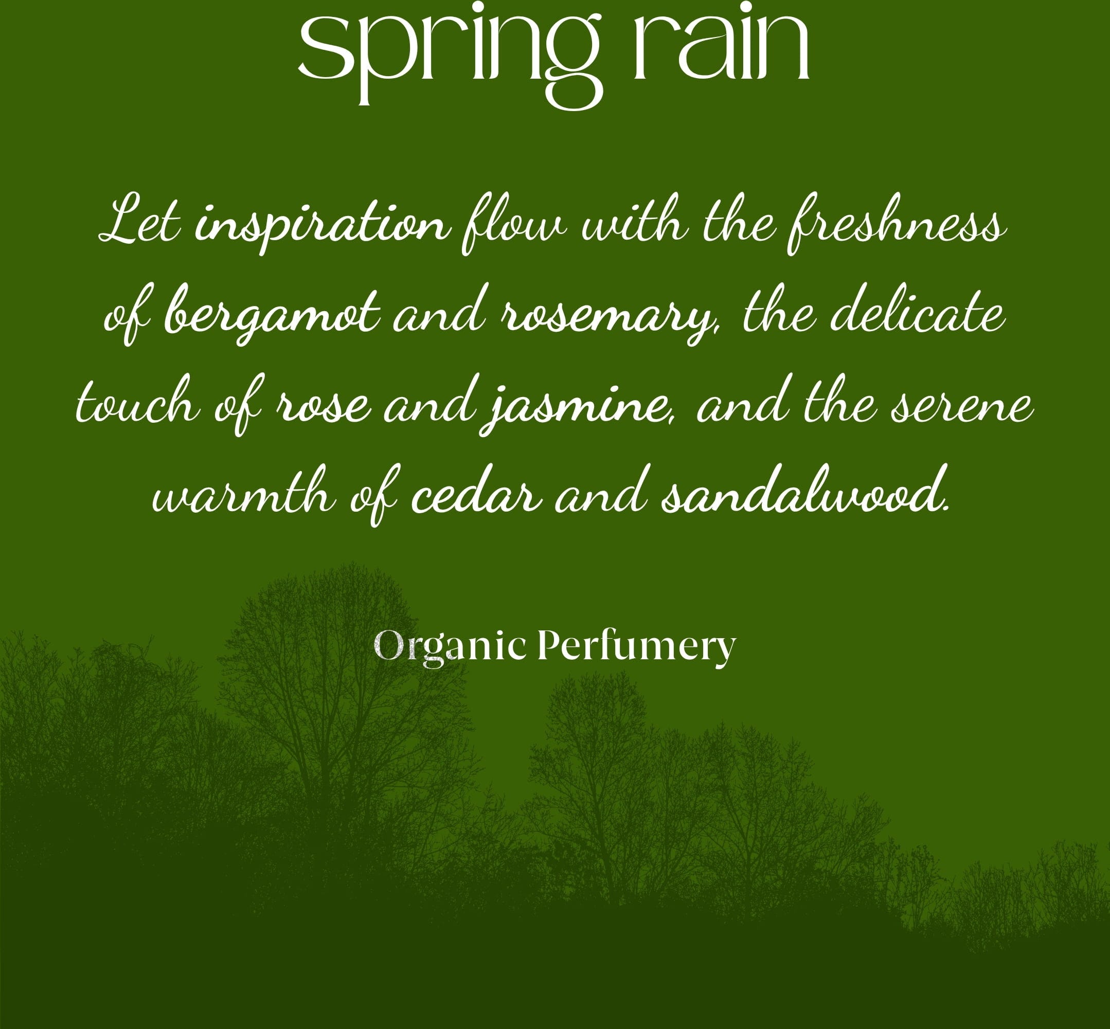 Spring Rain Organic Fresh Fragrance on aromaattinen vastaus kysymykseen ”Miltä kevätsade tuoksuu?”. Tuoksun koostumus tarjoaa raikkaan, kukkaisen elämyksen, joka vahvistaa tunteiden, muistojen ja aistien välistä yhteyttä. Käsintehtyyn kölninveteen maseroitu luomu-efeblatti antaa tuoksulle vieläkin luonnollisemman sävyn.