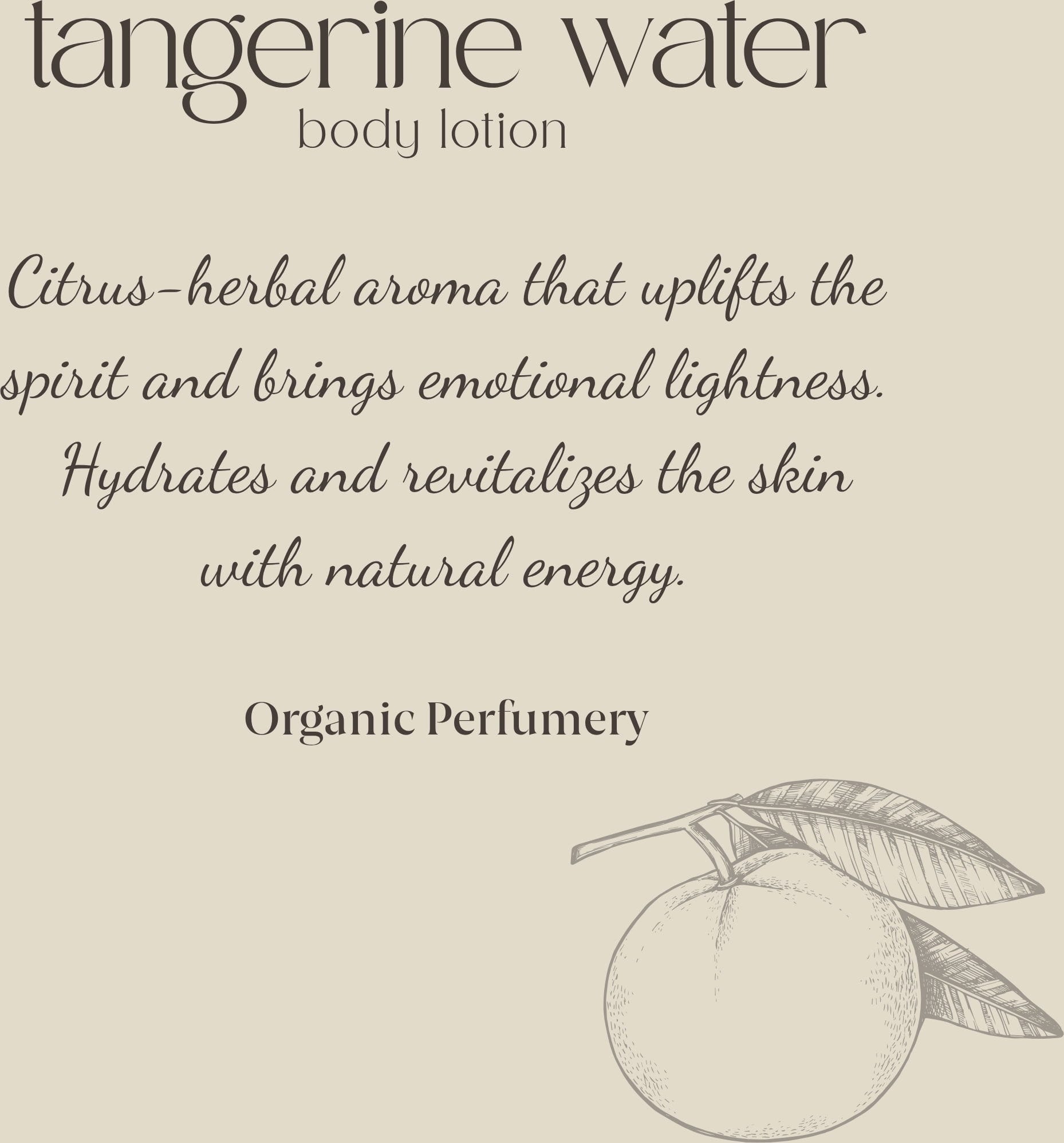 Tämän Tangerine Biorganic Body Lotion tuoksua voidaan kuvailla elämänriemun puhtaana kokemuksena. Miedot mandariinin tuoksut hivelevät aisteja samalla kun laadukas koostumus kosteuttaa ja hoitaa ihoa intensiivisesti.