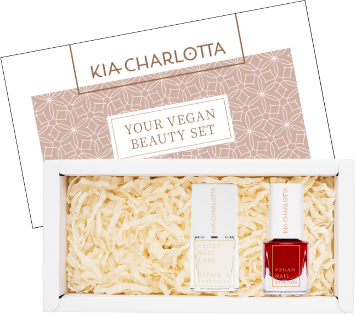 KIA-CHARLOTTA'n Care X-Mas Set yhdistää hoidon ja värin: Repair & Strength kynsikovettaja hoitaa ja suojaa kynsiäsi, kun taas punainen kynsilakka tuo upean glamour-ilmeen. Tämä duo on pakattu kauniiseen laatikkoon, joka ilahduttaa kaikkia kauneuden ystäviä.