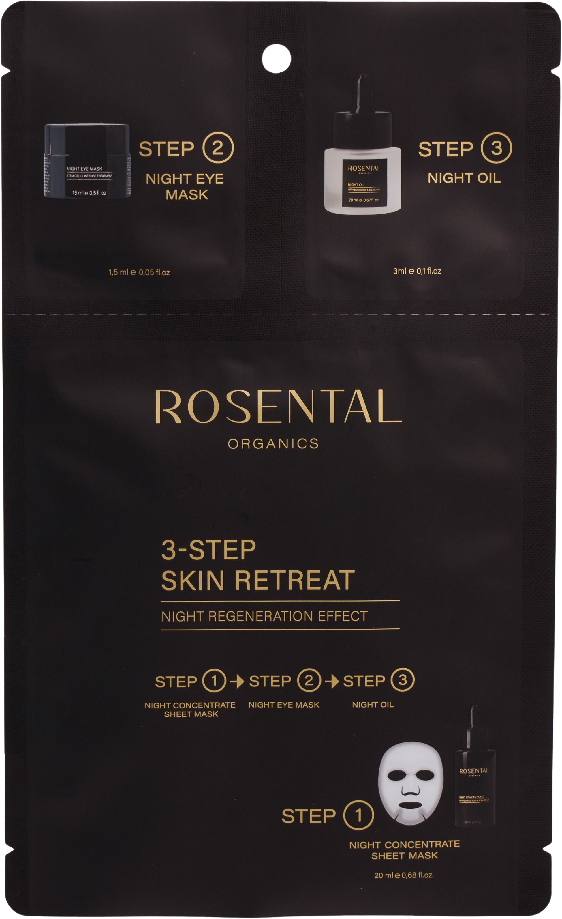 Tämä paketti sisältää kolmiportaisen intensiivisen yöhoidon. Se koostuu ylellisestä kolmen tuotteen yhdistelmästä niin kertakäyttöä kuin Rosental-suokkeihin tutustumista varten. Yhdessä nämä kolme tuotetta tarjoavat overnight-boostin, jonka tuloksena on sileämpi iho, levänneet silmät ja raikkaampi iho aamulla.