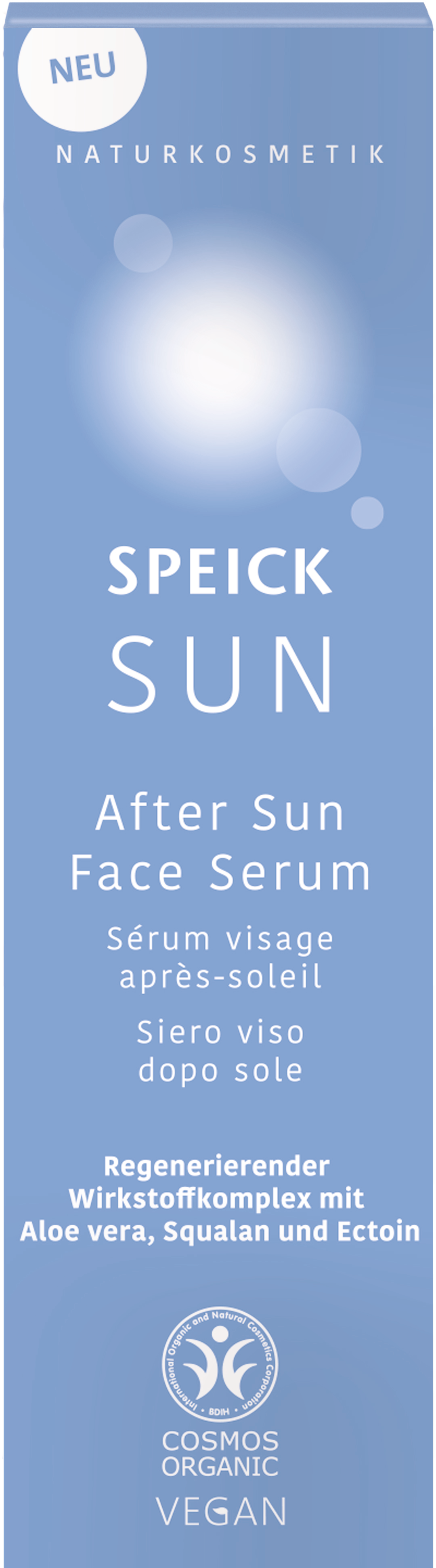 Hemmottele ihoasi intensiivisellä kosteuttavalla hoidolla auringonoton jälkeen After Sun Face Serum -kasvoseerumilla. Erittäin tiivis koostumus antaa intensiivistä kosteutusta ja hoitaa erityisesti auringon rasittamaa ihoa. Oliiviöljystä peräisin oleva skvalaani antaa silkkisen tuntuman, sitoo kosteutta ja tukee ihon luonnollista suojamuuria, kun taas ektoiini antaa lisäsuojaa ulkoisia ympäristövaikutuksia vastaan. Ainutlaatuinen Speick-kasvin uute tarjoaa erityisen uudistavan hoitokokemuksen myös herkälle iholle.