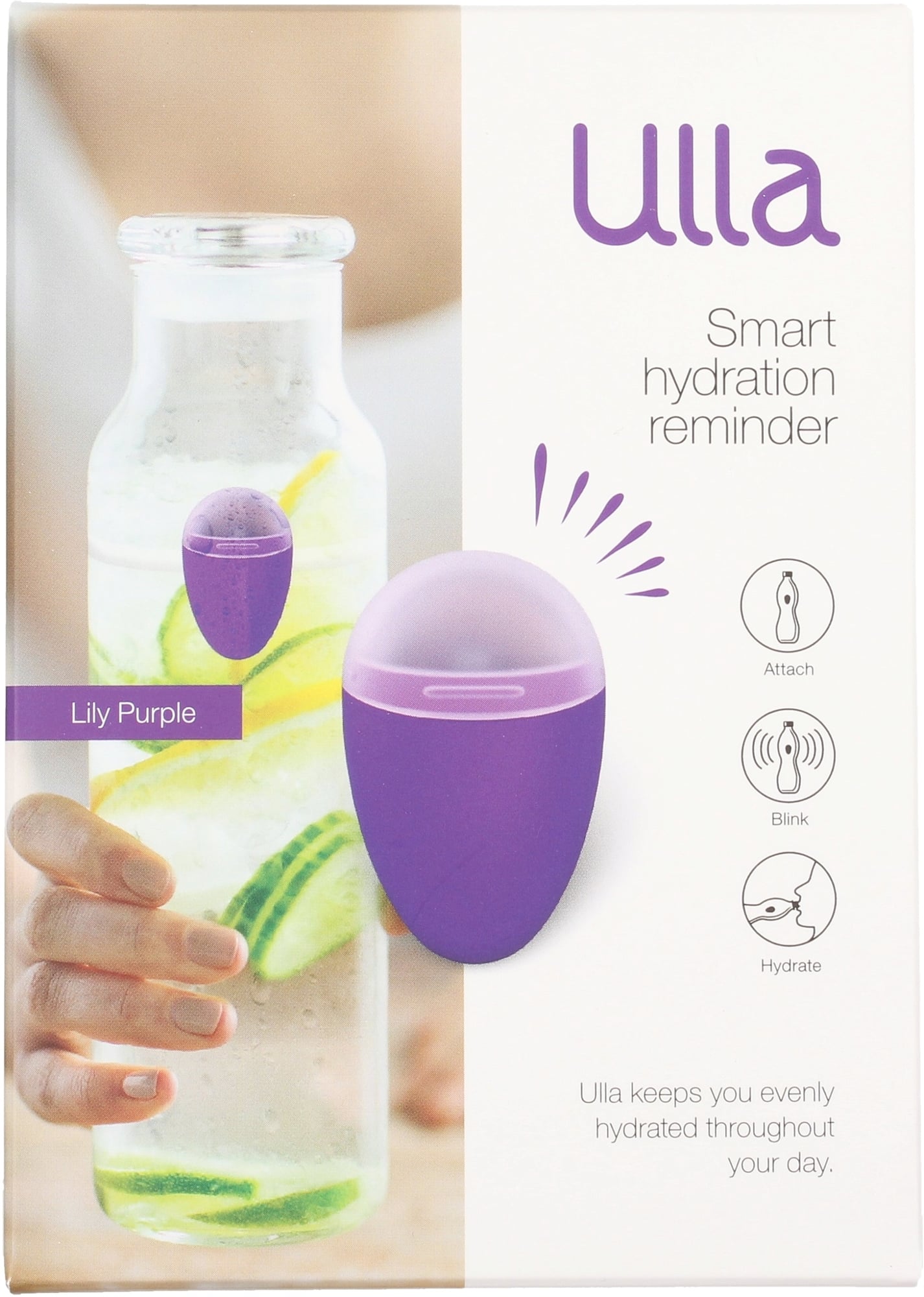 Ulla sopii kaikkiin pulloihin ja laseihin, ja se muistuttaa sinua pitkin päivää juomisen tärkeydestä. Tämä ystävällinen muistuttaja kertoo, kuinka usein sinun tulisi juoda päivän aikana. Ulla ei tarvitse omaa sovellusta, eikä akkukjen lataamista. Ulla on aina paikalla, mutta ei tielläsi.