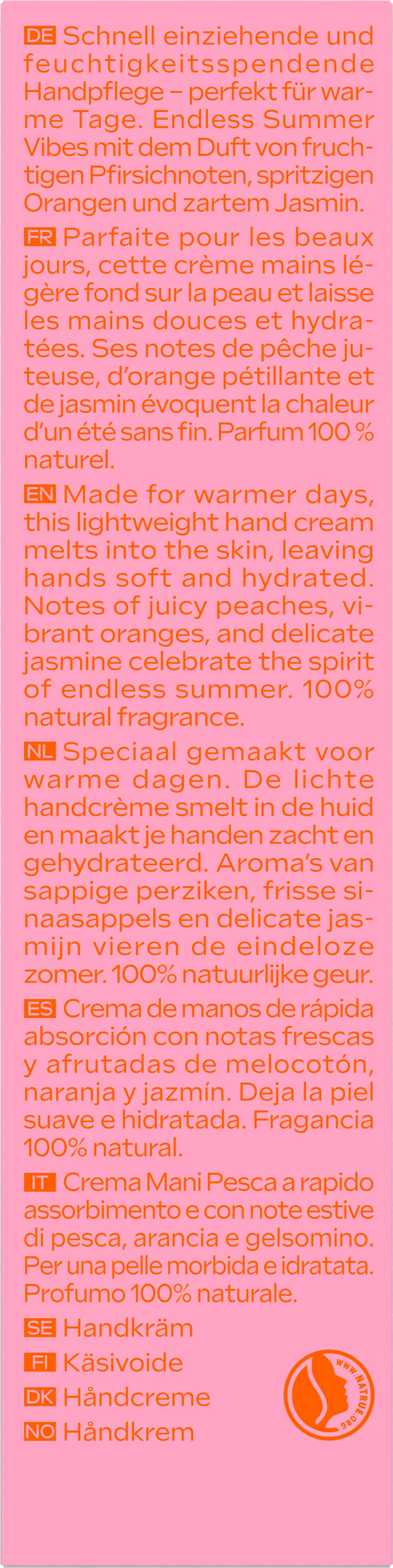 Pinkki Peach -käsivoide tarjoaa nopeasti imeytyvää ja kosteuttavaa käsienhoitoa. Se on täydellinen lämpimiin päiviin. Täydellisen kesätunnelman luo kuitenkin ihana tuoksu, jossa on hedelmäistä persikkaa, raikasta appelsiinia ja jasmiinia. Käsivoide kuin kuuma kesäpäivä!